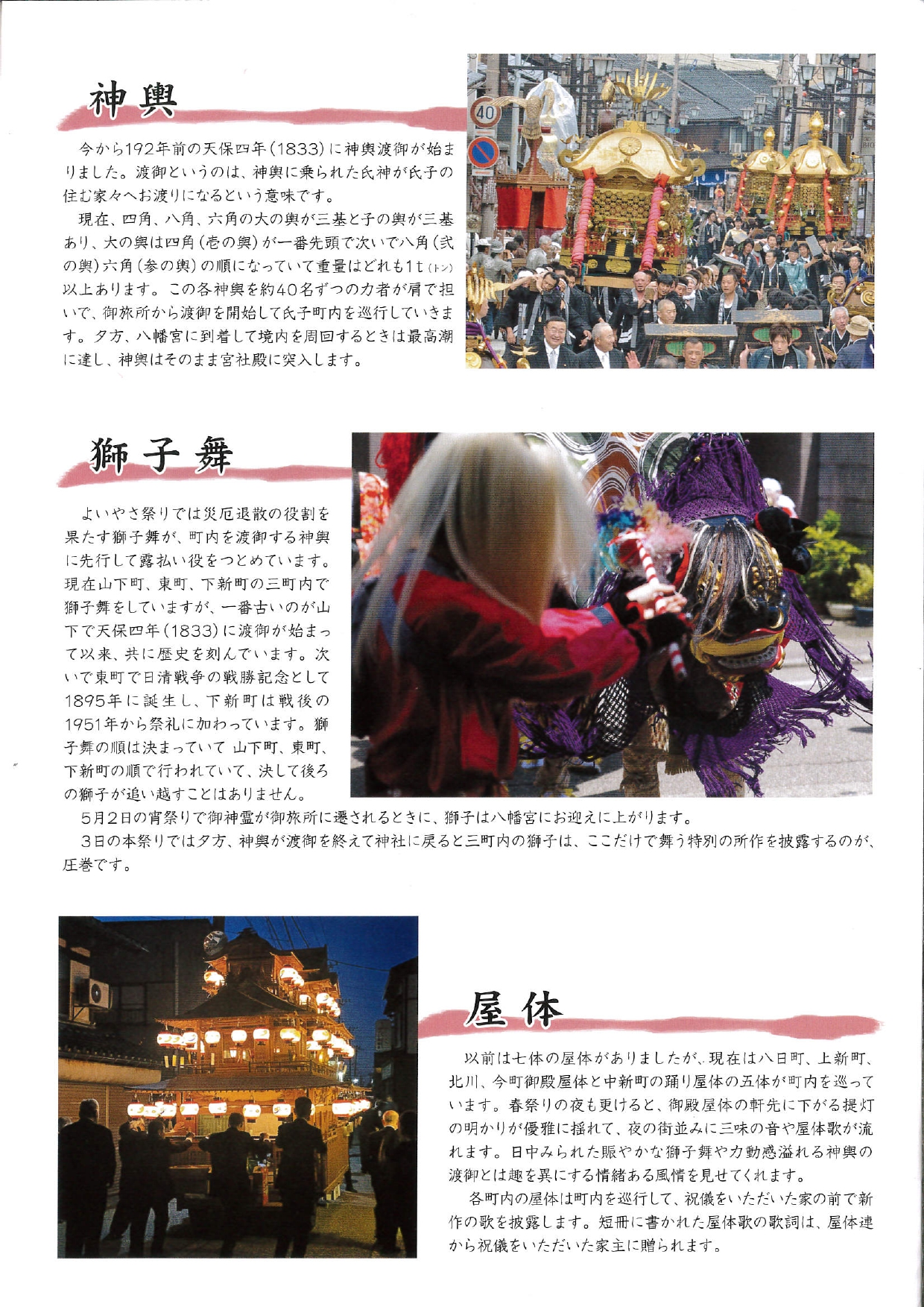 天保4年(1833)、商売繁盛・家内安全を祈願する神事として始まった祭り。 大人が担ぐ神輿は3種類あり、子ども神輿と合わせて6つの神輿が町内を練り歩き、3つの獅子と4つの屋体とともに町内を賑わせます。担ぎ手が約10kmを巡行する様、そして井波彫刻の技が光る獅子頭も見どころです。