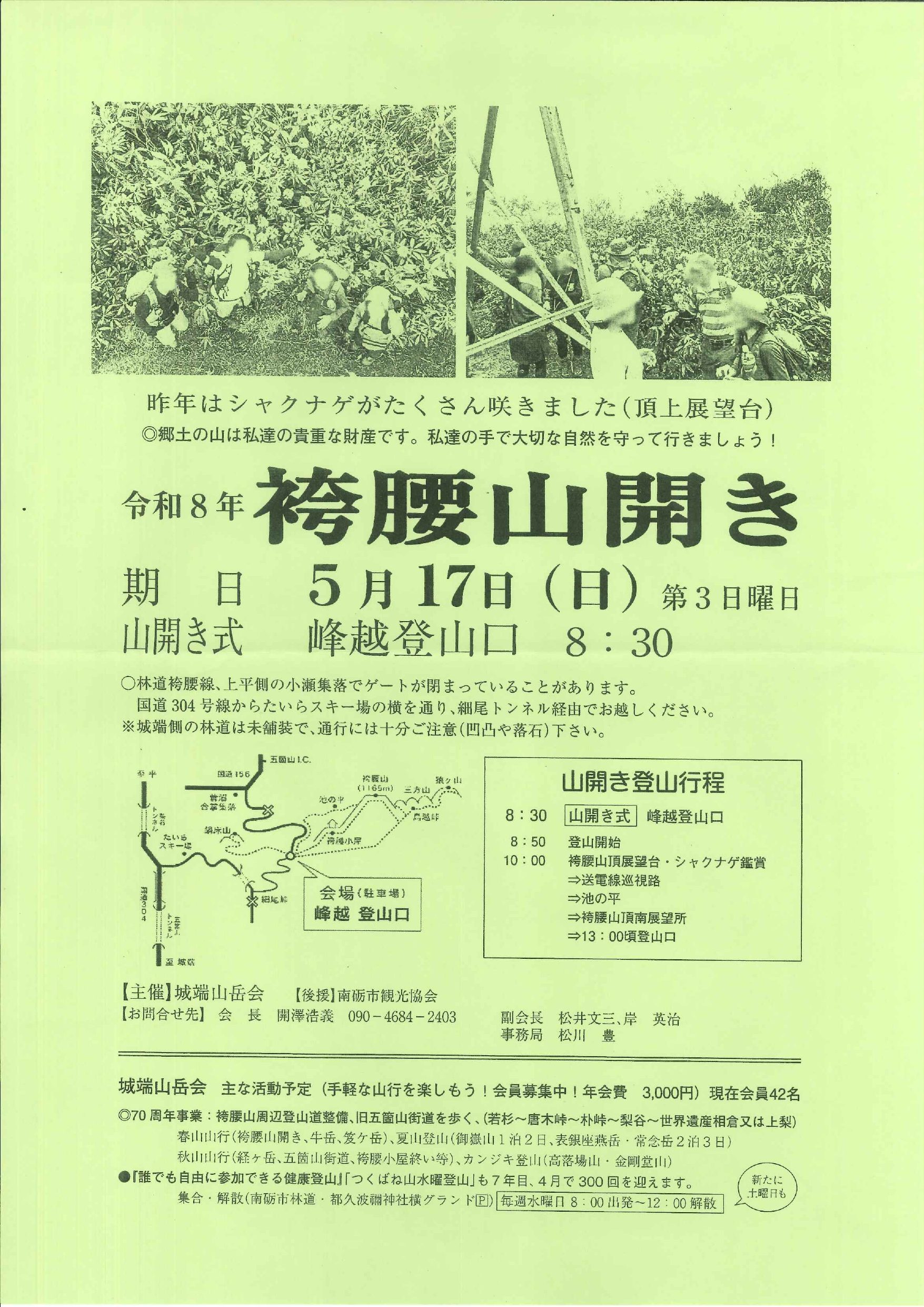 8:30 山開き式 8:50 登山開始 10:00 袴腰山頂上 展望台・シャクナゲ鑑賞