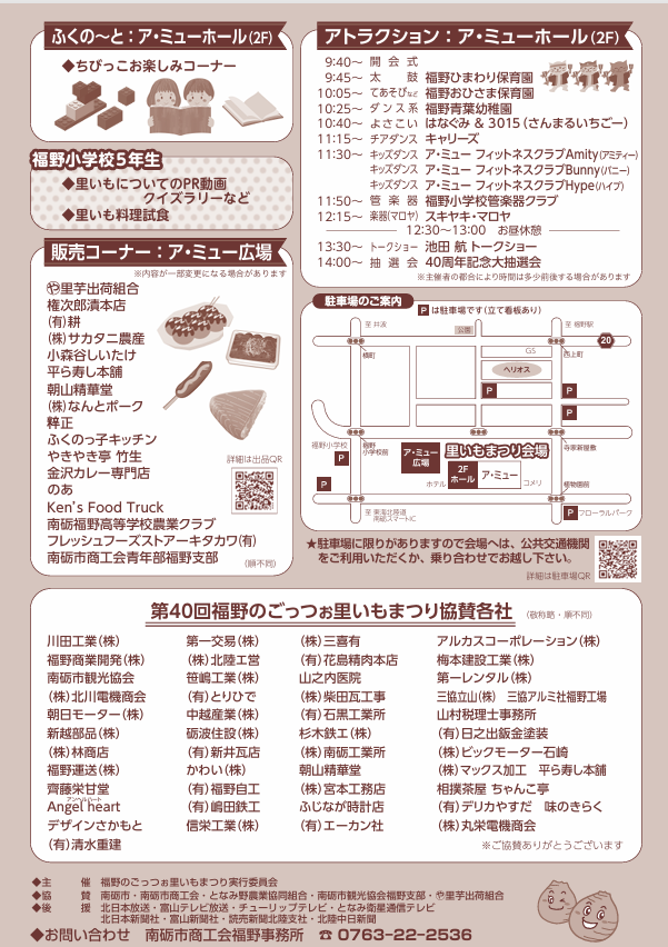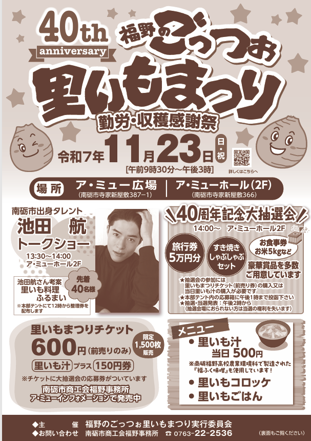おいしそうな匂いが漂う、絶品里芋グルメが並ぶ大人気のイベント。一度食べたらやみつきになる福野の里芋で作った、里芋コロッケや里芋ごはん、里芋スイーツ、里芋汁が販売され、その味は格別!会場は毎年たくさんの人で賑わいます。