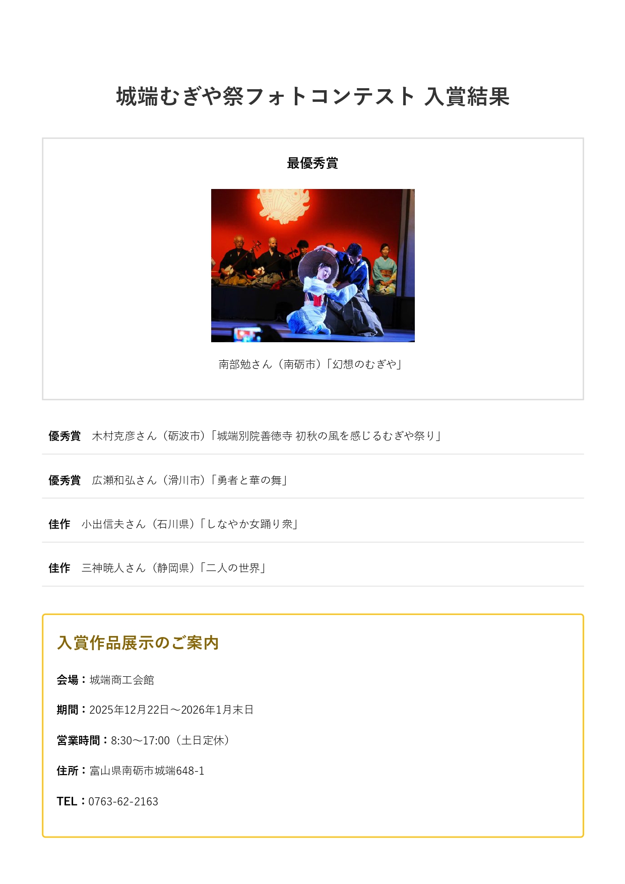 城端むぎや祭協賛会では、「第73回城端むぎや祭(9/14開催)」の写真作品を募集します。