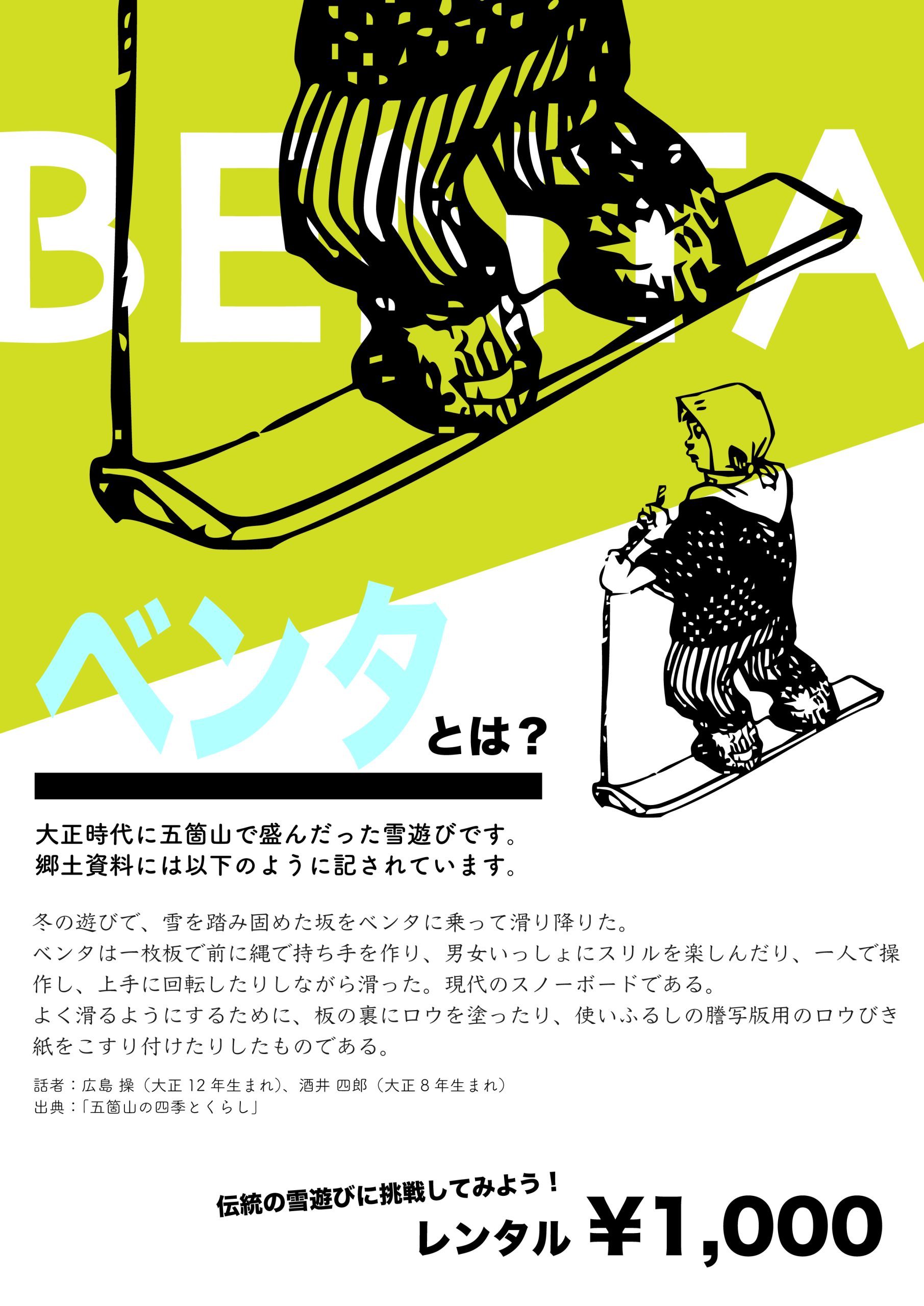 昔々、南砺市五箇山の子どもたちは、荷物を運ぶ「紐のついた板」を雪遊びの道具に変えていました。その名も「ベンタ」。