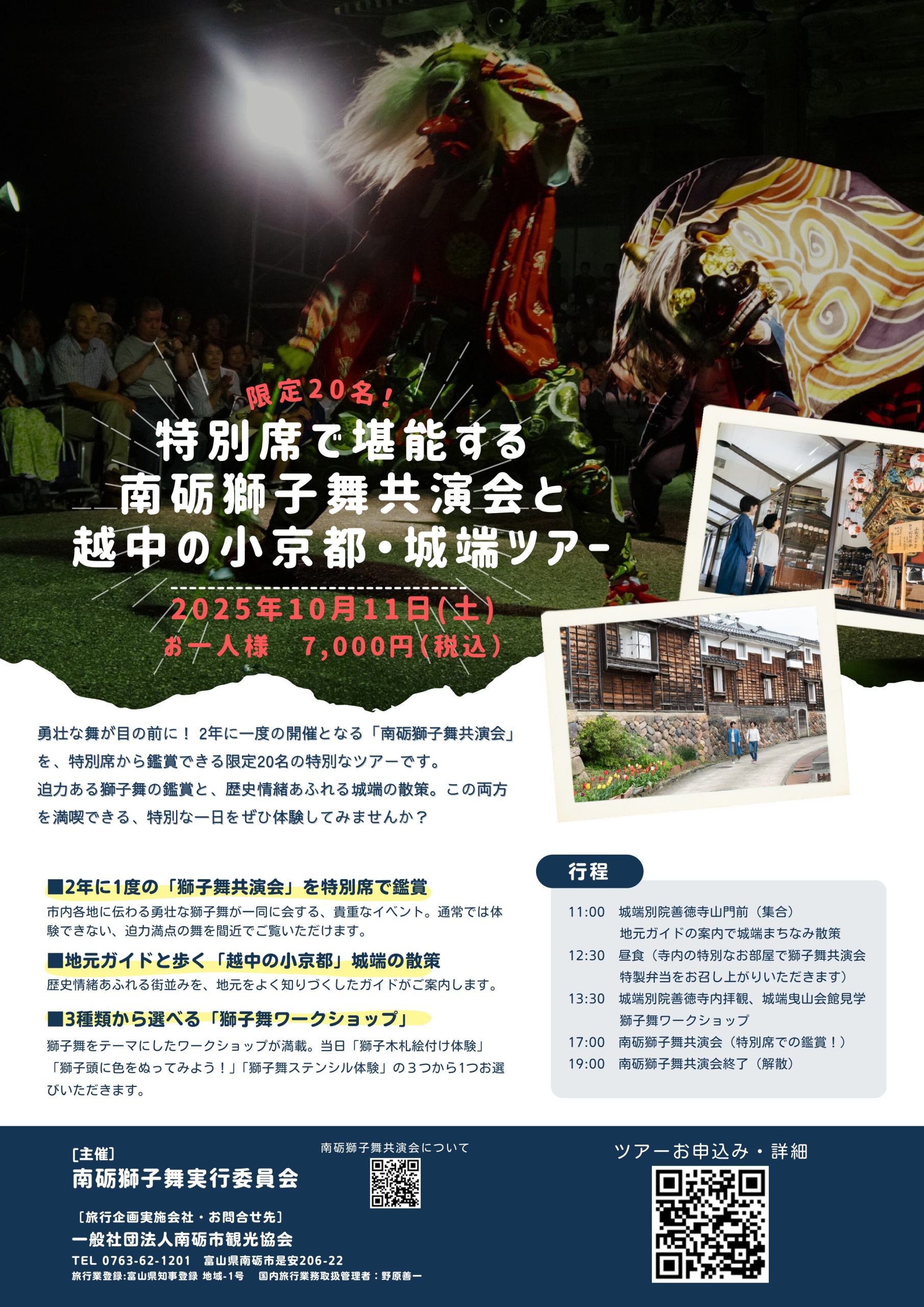 勇壮な舞が目の前に! 2年に一度の開催となる「南砺獅子舞共演会」を、特別席から鑑賞できる限定20名の特別なツアーです。
