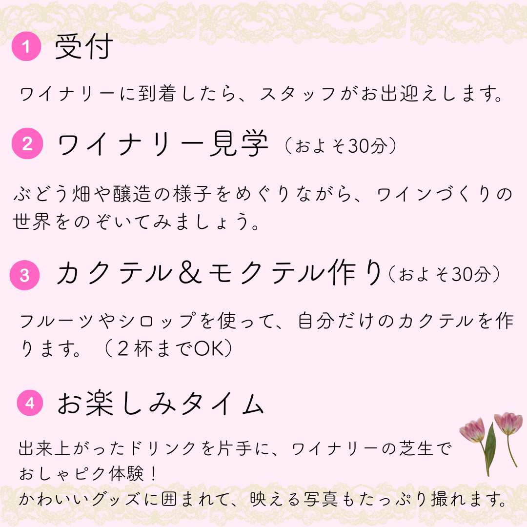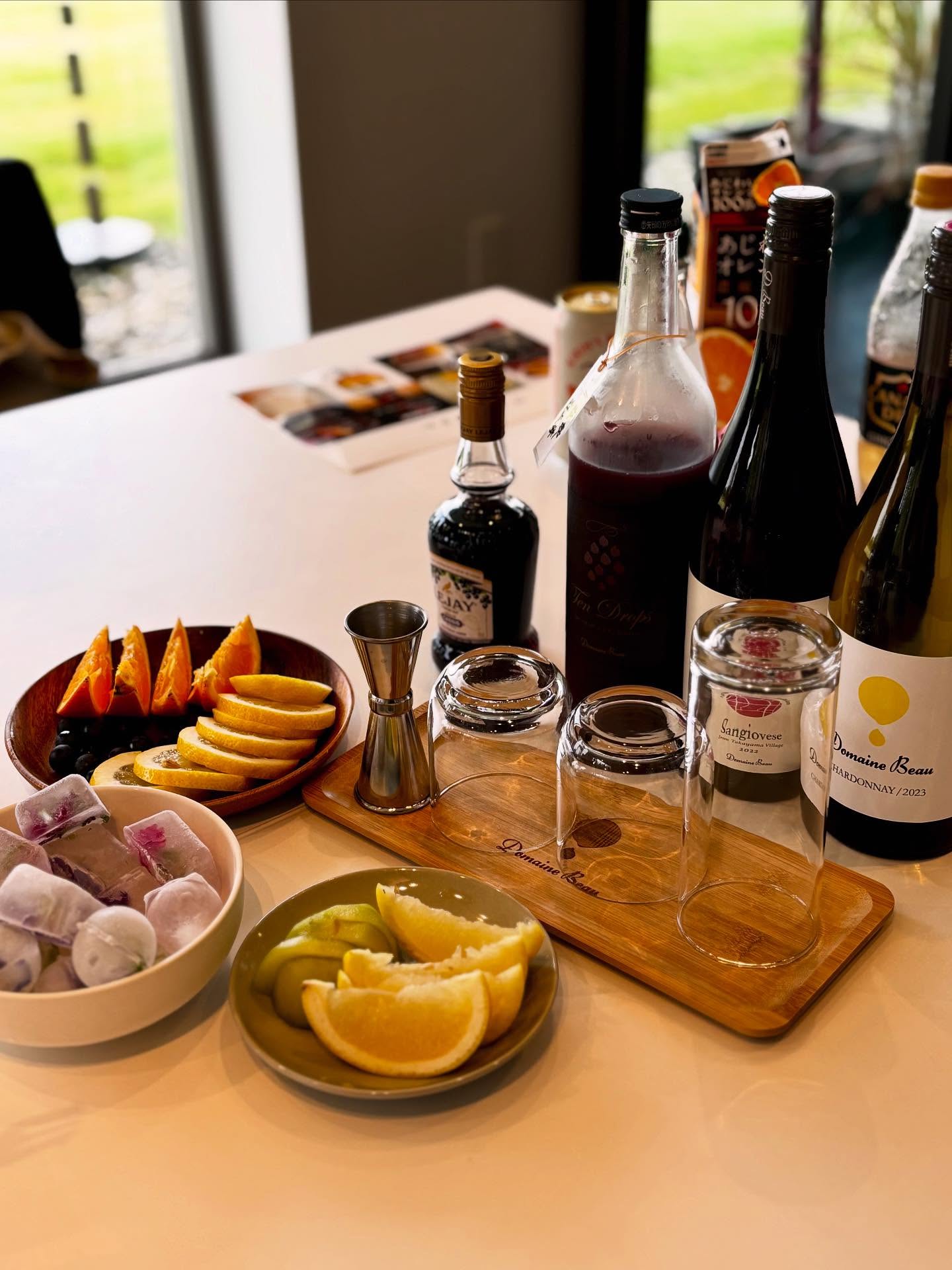 砺波平野を一望する絶景ワイナリーで、心ときめく体験を。広大なぶどう畑を独り占めするように散策し、ワインの香りに癒されるワイナリー見学の後は、お待ちかねのオリジナルカクテル作りタイム!カラフルな材料を自由に混ぜて、自分だけの一杯を作ってみませんか?お酒が飲めない方も、美味しいノンアルコールカクテル(モクテル)作りに挑戦できます。見て、学び、楽しめる、特別な休日を。