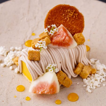 【昨年のメニュー】南砺ポークのグリル(あんぽ柿ソース)、地元産無農薬玄米と干柿のコロッケ、あんぽ柿のモンブラン仕立てなど