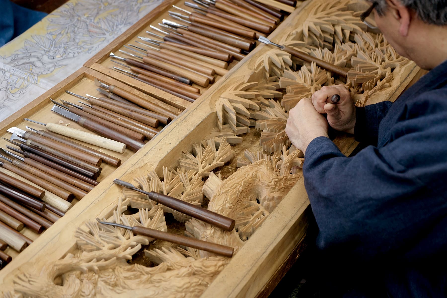 最大の特徴は、200本以上のノミを使い分け、一人の職人が全工程を仕上げる一貫体制です。特に板の両面から彫る「透かし彫り」は圧倒的な立体感を生み出します。紙ヤスリを使わず刃物の切れ味のみで仕上げる表面は、職人の魂が宿る鋭い美しさを放ちます。現在は現代の住空間に調和する新たな意匠開発にも挑み続けています。