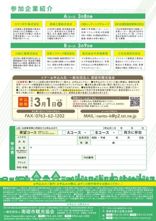 南砺市では、南砺市内企業への就職の促進を図るため、南砺市内企業を見学するバスツアーを実施します。県外に進学した学生の方々も是非ご参加ください。