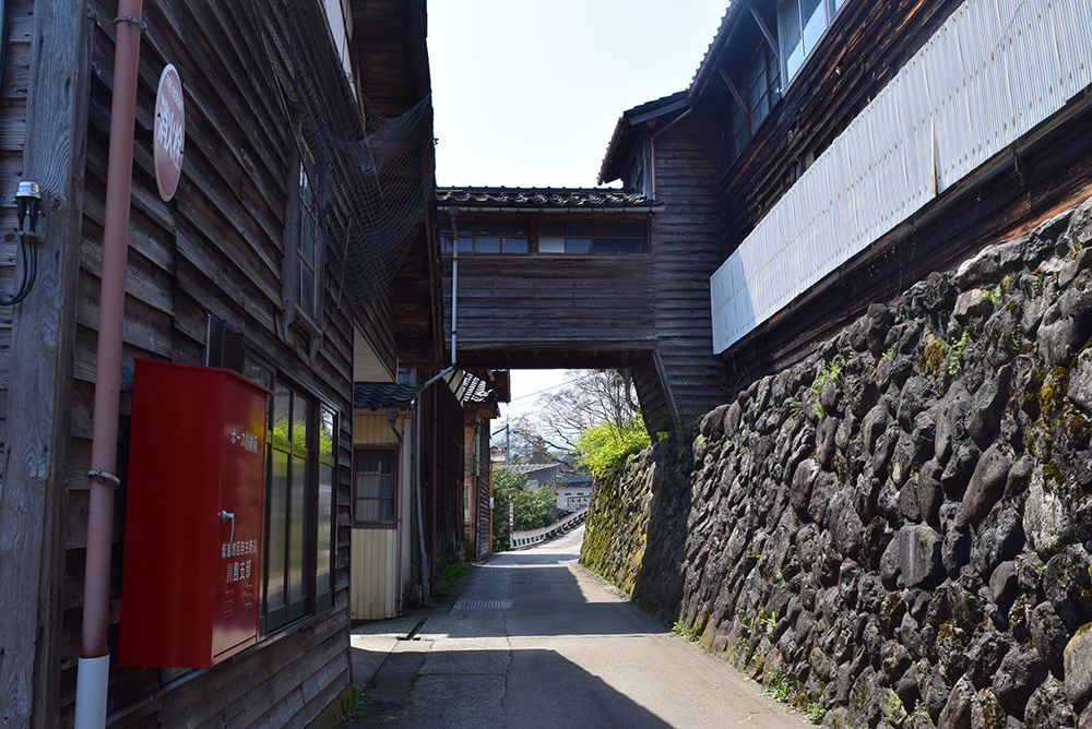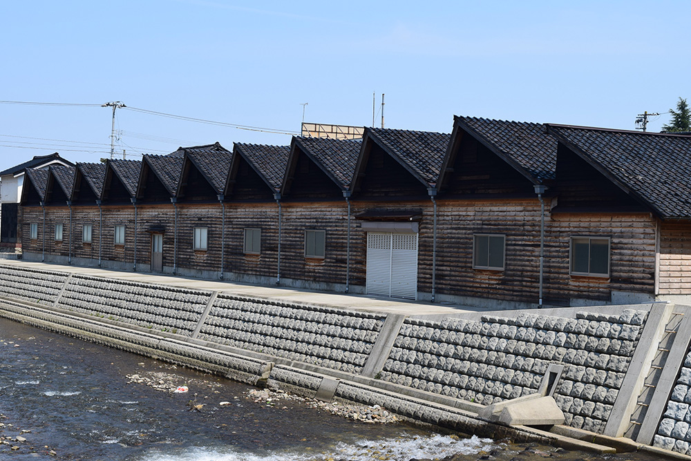 京都西陣の老舗「旧川島織物」を創業した川島甚兵衛の出身地。川越しに、三角屋根が連なるかつての機織り工場が見られます。往年の”絹のまち城端”の名残が伺えます。